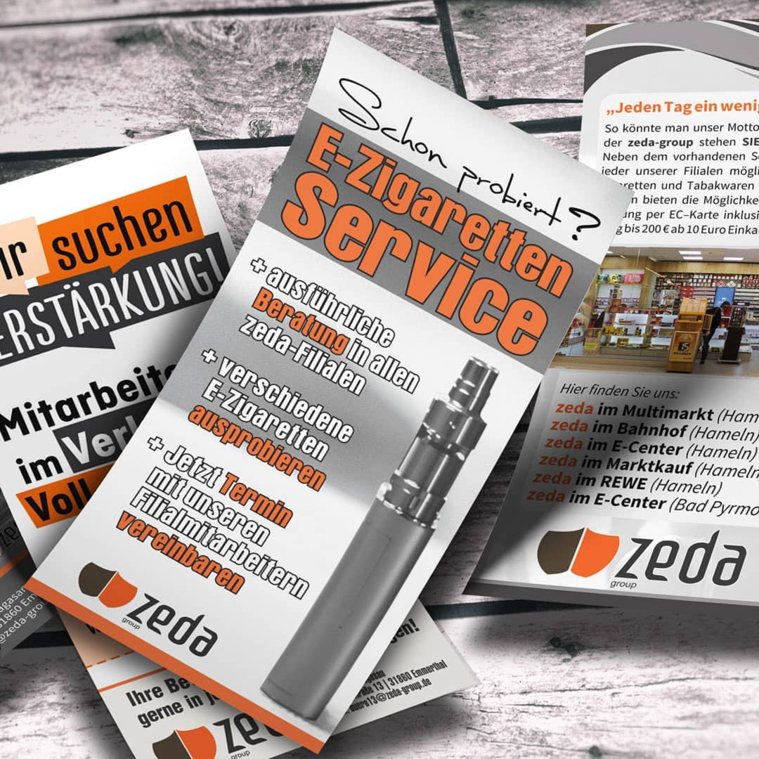 Flyergestaltungen & Druck von 3.000 Exemplaren für die zeda – group. Zeda ist dieses Wochenende auch mit einem von mir gestalteten Messestand und Werbegeschenken wie 500x Notizblöcke und 250x Drei-Monats-Kalendern für 2020 auf dem Pflasterfest in Hameln vertreten, schaut mal vorbei.
